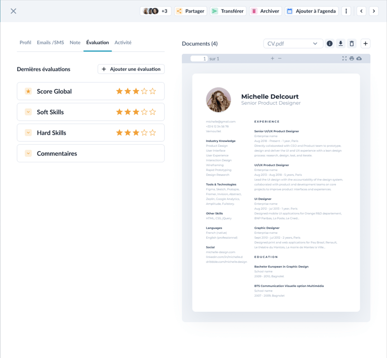 Il existe deux catégories de compétences à évaluer : les hard skills, c'est-à-dire les compétences techniques du candidat (maîtrise d’un logiciel, niveau en langues étrangères etc…), et les soft skills : les compétences qui ne sont pas liées directement au travail. Cela peut concerner les compétences communicationnelles, la capacité d’écoute, l’autonomie etc. Négliger certaines compétences au détriment d'autres peut être décisif pour votre recrutement. Pour limiter les erreurs de recrutement, nous avons ajouté un espace "Évaluation" comprenant les Hard skills, Soft skills et les commentaires d'entretiens. En quelques clics, vous connaissez tout l'historique du candidat !